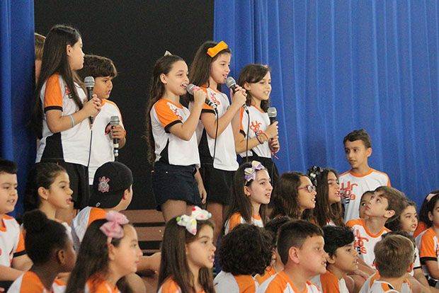 A próxima atividade foi a apresentação musical dos alunos da Educação Infantil, que cantaram as canções “Florzinha do Meu Jardim”, “Mamãe” e “Hugs and Kisses”. A última música foi apresentada em inglês, pois os alunos da EI participam do projeto Bright Futures, que é feito em parceria com a Oxford University Press.