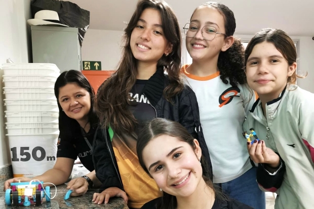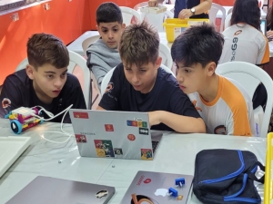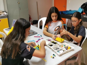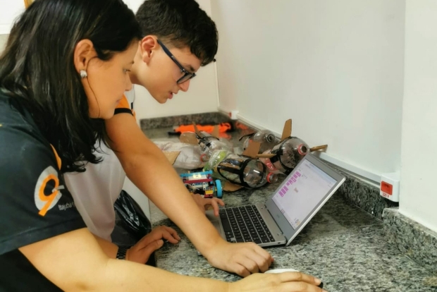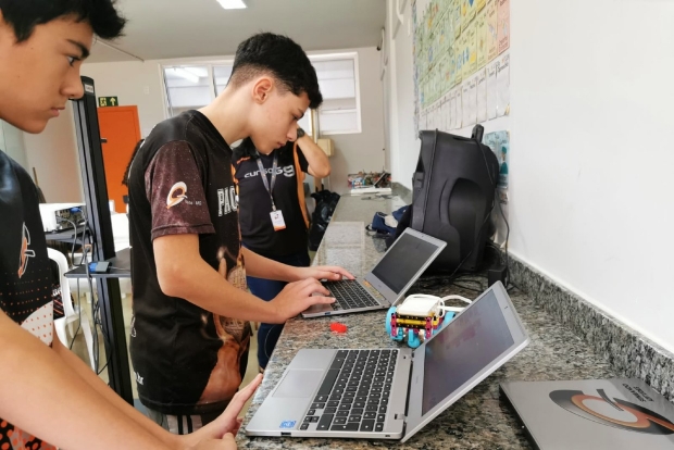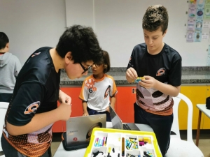 robôs Spike durante uma aula de robótica. Os desafios propostos envolveram a