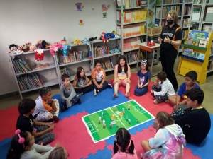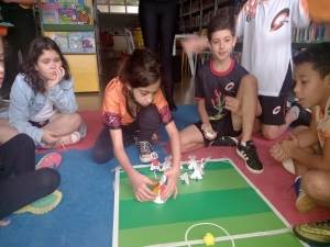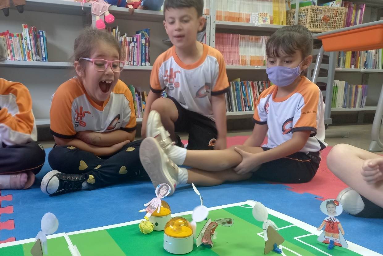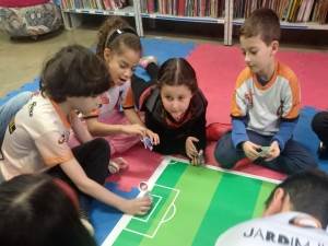 Após as pesquisas, foi proposto uma atividade com o robô MatataLab, que foi usado pelo alunos como “jogadores de futebol”: foram realizadas diversas e divertidas partidas na Biblioteca – os alunos tiveram que programar o robozinho para fazer o percurso até o gol.