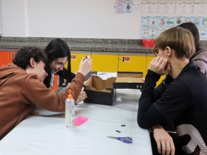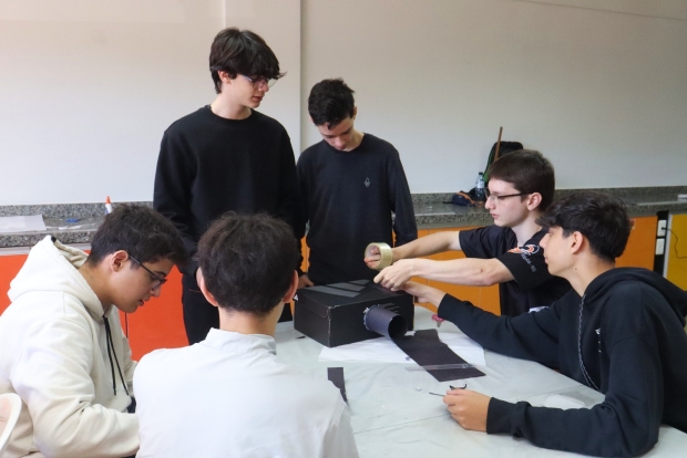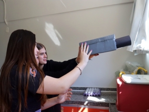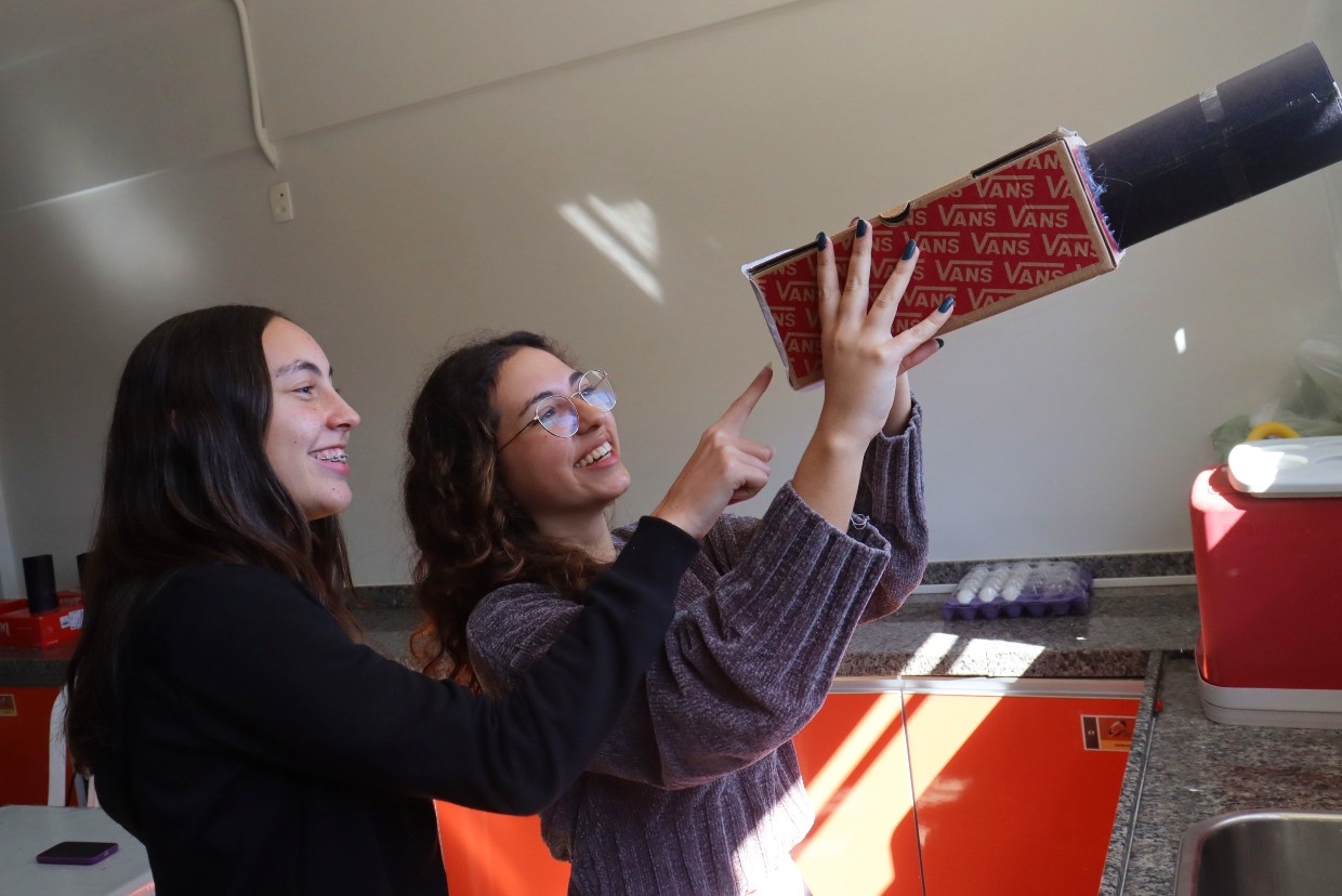 com lente convergente, utilizando materiais recicláveis, durante aula no Espaço