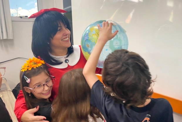 A professora Vanessa Dalla Rosa e o monitor Jhonatann Santos encenaram uma peça teatral para sensibilizar os alunos do Ensino Fundamental I para a Feira do Conhecimento 2025, que que tem como tema geral “Atitudes para renovar o mundo”. Como Mafalda e Miguelito, respectivamente, a dupla abordou temas importantes para a sustentabilidade do planeta. Mafalda, a icônica personagem criada pelo cartunista argentino Quino, é uma menina de seis anos, que tem um profundo senso de justiça e uma visão muito crítica sobre o mundo ao seu redor. Mafalda sempre busca um mundo melhor. Ela ensina que devemos pensar sobre o que acontece à nossa volta. Não precisamos aceitar tudo como está, podemos fazer perguntas e buscar mudanças! Ela também nos lembra da importância de cuidar do nosso planeta e tratar os outros com respeito.A Feira do Conhecimento é o maior projeto institucional do Curso G9 e tem a missão de compartilhar conhecimento com a comunidade em geral. O projeto envolve alunos da Educação Infantil ao 2º ano do Ensino Médio.