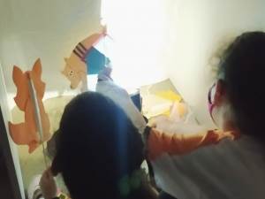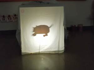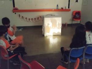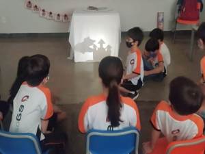 de um pano branco e com as luzes apagadas as crianças ouviram a história