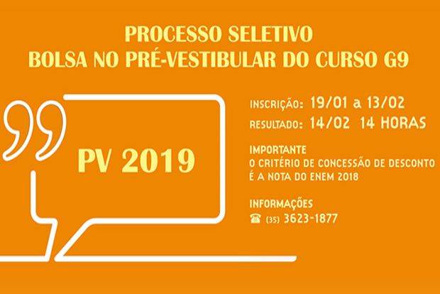 Estão abertas, desde 19 de janeiro, as inscrições para o processo seletivo de bolsa de estudo para o Pré-vestibular do Curso G9. O critério para a concessão dos descontos é a nota do ENEM (Exame Nacional do Ensino Médio) 2018: quando maior a nota, maior o desconto.