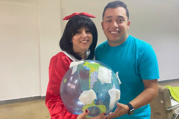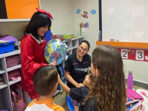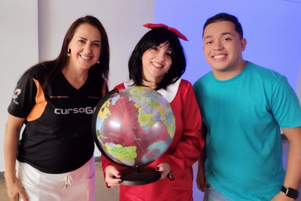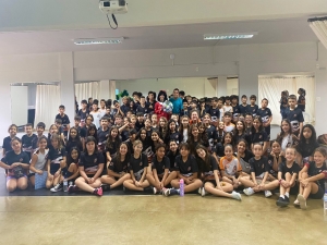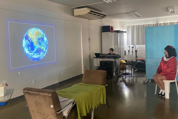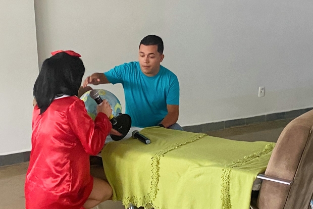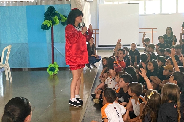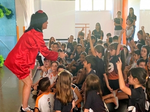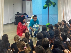 A professora Vanessa Dalla Rosa e o monitor Jhonatann Santos encenaram uma peça teatral para sensibilizar os alunos do Ensino Fundamental I para a Feira do Conhecimento 2025, que que tem como tema geral “Atitudes para renovar o mundo”. Como Mafalda e Miguelito, respectivamente, a dupla abordou temas importantes para a sustentabilidade do planeta.